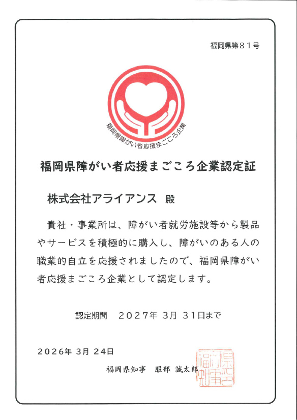 福岡県「障がい者応援まごころ企業」認定